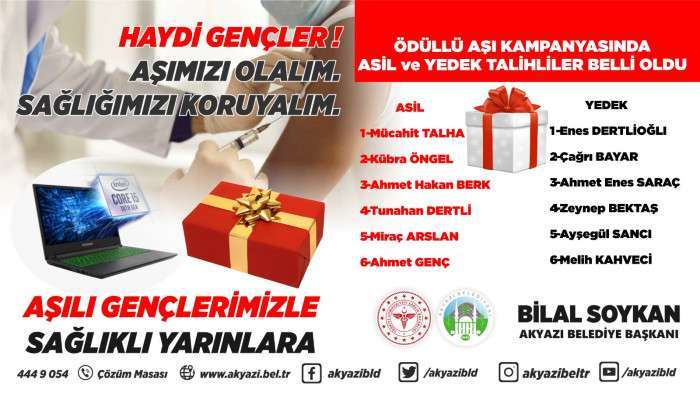 Akyazı Belediyesi ve İlçe Sağlık Müdürlüğü tarafından 31 Ağustos 2021 – 28 Eylül 2021 tarihlerinde 18 - 30 yaş arası gençlere “ Haydi Gençler Aşımızı Olalım Sağlığımızı Koruyalım” kampanyası kapsamında İlçe sağlık Müdürlüğü önünde yapılan aşılama kampanyasına ilçe genelinden 82 genç vatandaşımız ilk doz Covid-19 aşılarını vurdurmuş ve MSI marka dizüstü oyun bilgisayarı çekilişine katılmaya hak kazanmıştı.