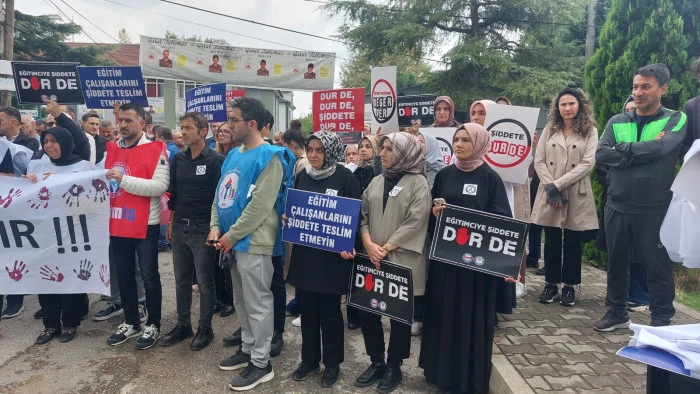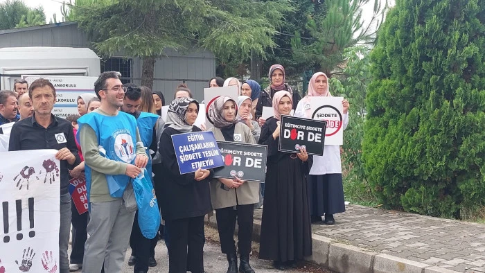 “Eğitimciye uzanan eller cezalandırılsın” ve “Şiddete hayır” sloganlarıyla öğretmenlere yönelik şiddetin son bulması çağrısı yapıldı.