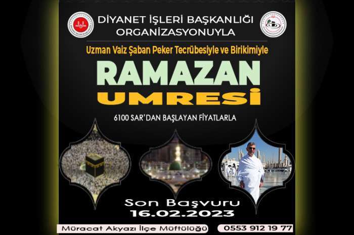 Akyazı müftülüğünden yapılan açıklamada uzman vaizi Şaban Peker rehberliğinde ve tecrübesiyle onbir ayın sultanı ramazanda kutsal toprakları ziyaret ediyoruz. Bizimle o mübarek yerlere gelmek isteyen kardeşlerimiz Haydi bismillah…