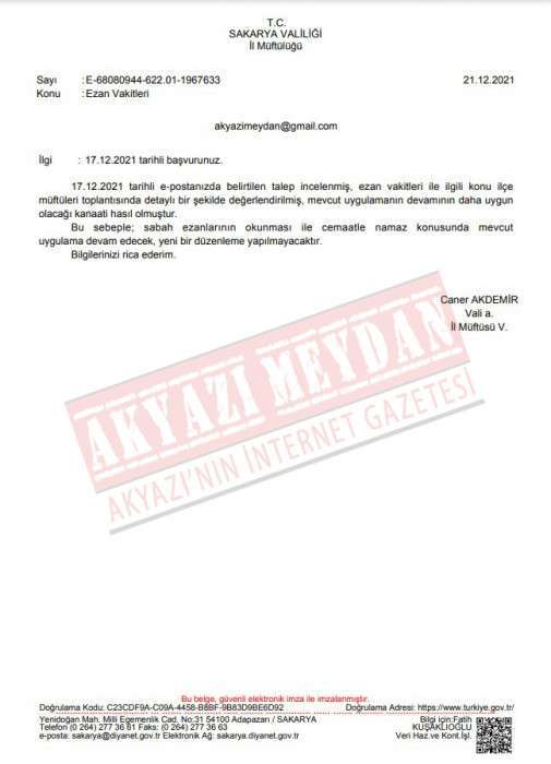 Konu ile ilgili Akyazı ilçe müftüsü Kâmil Özcan Demir Akyazı Meydan’a yaptığı açıklamada konu daha önceden ilçe müftüler toplantısında değerlendirilmiş Kocaeli, Düzce, Sakarya illerinde ezan vakitlerinde değişiklik olmayacağı kararı alınmıştı. Namaza eda edecek vatandaşlarımızın sabah namazı vakit girdiği için namaza eda edilebileceklerini ifade etti.
