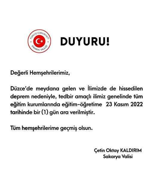 Sakarya Valisi Çetin Oktay Kaldırım sosyal medya hesabından duyurdu Çetin yaptığı açıklamada “Değerli Hemşerilerimiz, Düzce’de meydana gelen ve ilimizde de hissedilen deprem nedeniyle, tedbir amaçlı ilimiz genelinde tüm eğitim kurumlarında eğitim-öğretime 23 KASIM 2022 tarihinde (1) gün ara verilmiştir Tüm hemşerilerimize geçmiş olsun” dedi.