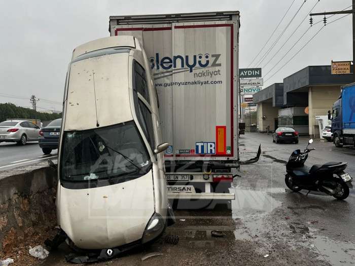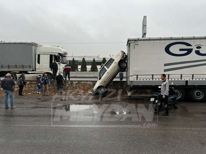 Sakarya'nın Erenler ilçesi Kozluk mahallesi D-100 karayolunda seyreden ismi öğrenilemeyen sürücünün kontrolünden çıkan otomobil savrulup park halindeki TIR'da asılı kaldı.