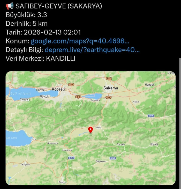 Sakarya’nın Geyve ilçesinde gece saatlerinde meydana gelen deprem kısa süreli paniğe neden oldu. Kandilli Rasathanesi ve Deprem Araştırma Enstitüsü (KRDAE) verilerine göre, yerel saatle 02:01’de kaydedilen sarsıntının büyüklüğü 3.3 olarak ölçüldü.