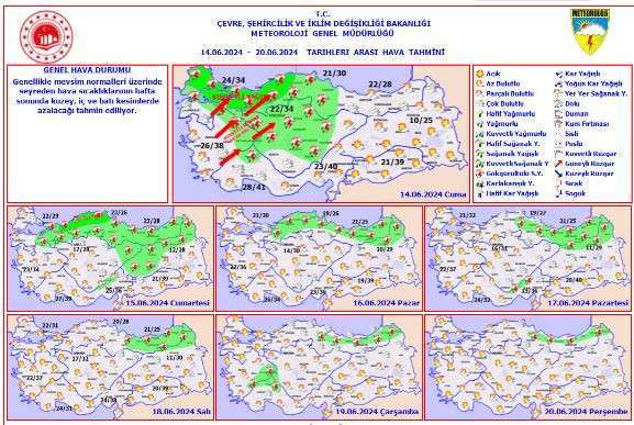Yapılan son değerlendirmelere göre; 14.06.2024 Cuma günü öğle saatlerinden sonra İç Ege, Marmara’nın güneyi, Göller Yöresi ile Eskişehir çevrelerinde rüzgarın batı ve güneybatı yönlerden kuvvetli ve kısa süreli fırtına şeklinde (50-70 km/saat, kısa süreli 80 km/saat) esmesi beklendiğinden ulaşımda aksamalar, çatı uçması, toz savrulması gibi olumsuzluklara karşı dikkatli ve tedbirli olunması istenildi.