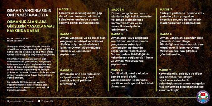 Orman yangınlarında mücadele kapsamında Sakarya valiliği 1 ay süreyle 30 Temmuz 31 Ağustos tarihleri arasında ormanlara girmek, orman çevresinde ve içerisinde mola vermek ormanlık alanlarda piknik yapmak yasaklandı.