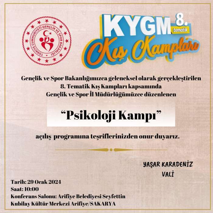 Gençlik ve Spor Bakanlığı, Kredi ve Yurtlar Genel Müdürlüğü (KYGM) tarafından düzenlenen geleneksel kış kampları, bu yıl farklı on farklı temaile on farklı ilde gerçekleştirilecek. Psikoloji Kampı ise 29 Ocak - 2 Şubat tarihleri arasında Sakarya'da düzenlenecek.