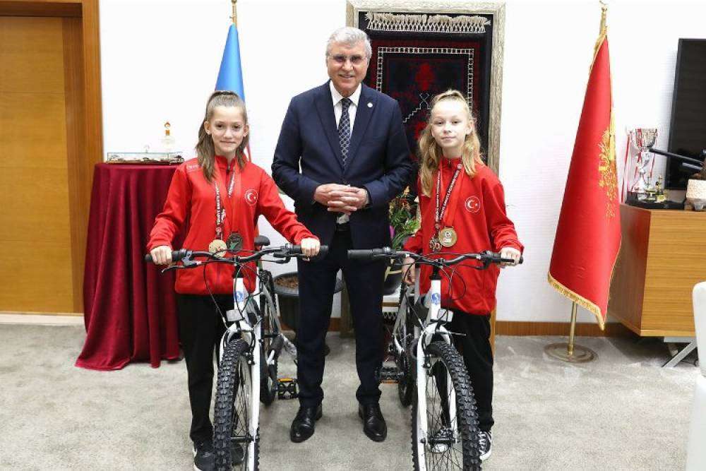 Balkan Şampiyonasında birincilik ve üçüncülük elde eden Yağmur Şevval Dursun ve Elif Burukoğlu’na Başkan Yüce bisiklet hediye etti.