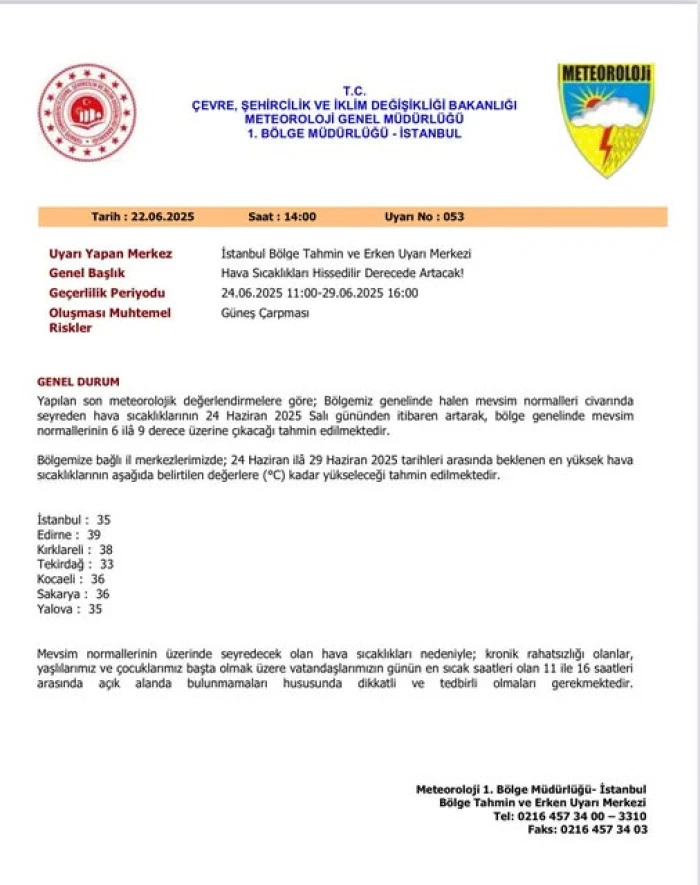 Çevre, Şehircilik ve İklim Değişikliği Bakanlığı Meteoroloji Genel Müdürlüğü 1. Bölge Müdürlüğü'nden alınan son verilere göre, Sakarya'da hava sıcaklıkları mevsim normallerinin oldukça üzerine çıkacak. Özellikle 24 Haziran Salı ile 29 Haziran Pazar tarihleri arasında, saat 11.00 ile 16.00 arasında hava sıcaklıklarının 36°C'ye kadar yükselmesi bekleniyor. Bu durum, güneş ve sıcak çarpması gibi sağlık risklerini beraberinde getireceği için vatandaşların dikkatli olması gerekiyor.
