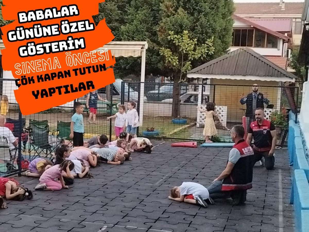 Film öncesi çocuklarla eğlenceli vakit geçiren SAKTİM görevlileri çök kapa tutun hareketiyle deprem anında yapılması gerekenleri anlattılar.