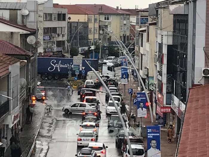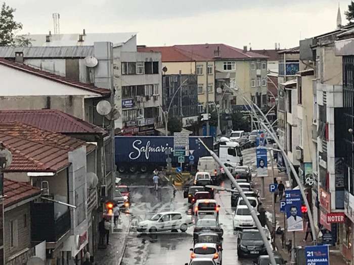 Öğlen saatlerinde Konuralp ilköğretim okulu kavşağında Necati Temel Caddesinden çıkış yapan bir tır kavşakta takıldı. Yasaklı saattte şehir merkezine giren TIR’ın refüj nedeni ile dönüş yapamayınca sürücü geldiği yöne geri gitti. Bir süre kapalı kalan trafikte bazı sürücüler geri dönüp başka güzergâhtan yollarına devam ettiler.