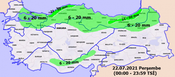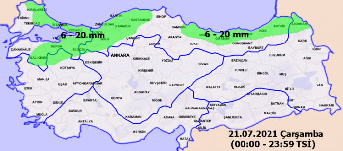 22.07.2021 - Perşembe günü yağış devam edecek. Günün en yüksek sıcaklığı 4 derece azalarak 27 derece en düşük hava sıcaklığı ise 20 derece olması bekleniyor..20