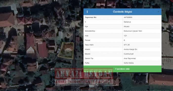 Akyazı Kadastro Müdürlüğünde incelenen taşınmaza ait kadastral paftaya göre parsel üzerinde; 91 m² oturum alanlı 1 adet yapı işli vaziyettedir. Mahallinde yapılan incelemelerde taşınmaz üzerinde; ayrık nizamda, 3/A yapı sınıfında, zemin kat olarak inşa edilmiş toplam yaklaşık 1 adet yapı inşa edildiği görülmüştür. Taşınmazın keşfi dışarıdan yapılmış olup, alan, mimari planlama ve dekorasyon özellikleri hakkında bilgi edinilememiştir. Uydu görüntülerinden yapılan incelemelerde parsel üzerinde yer alan yapının kadastral paftası ile uyumlu olduğu düşünülmektedir.