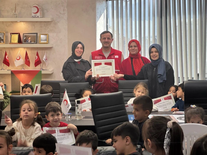 Programın en anlamlı durağı ise J&J Konuralp İlkokulu anasınıfı öğrencileri oldu. Şubede ağırlanan miniklere, Gazze için gerçekleştirdikleri duyarlı etkinlikler nedeniyle teşekkür belgeleri takdim edildi. Şube Başkanı Birincioğlu, bu duyarlılığın kendilerini hem duygulandırdığını hem de umutlandırdığını ifade ederek, bu bilinci aşılayan öğretmenlere teşekkür etti.