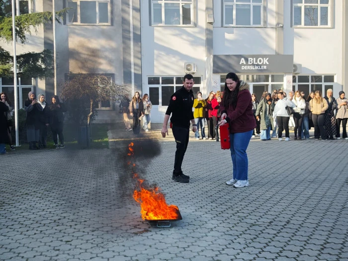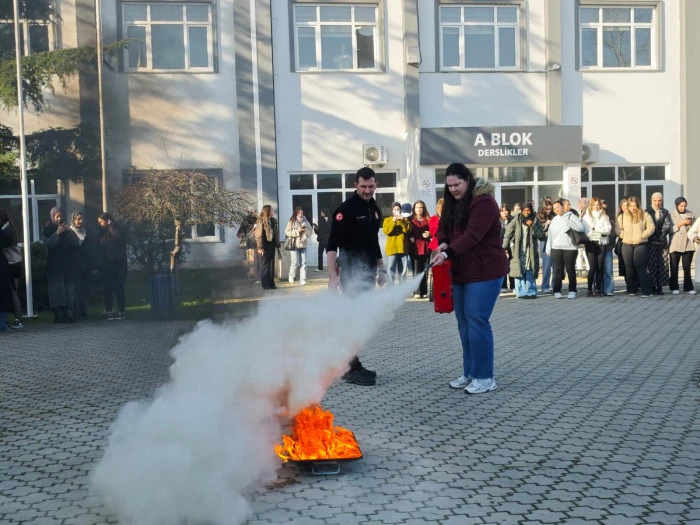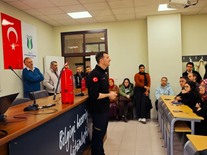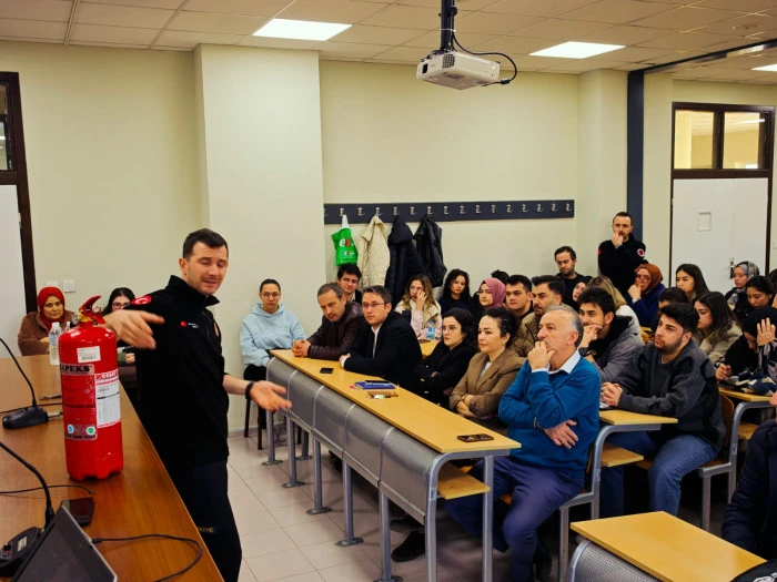 Yangın Söndürme ve Tahliye Tatbikatı Eğitmeni Mehmet Enes Sezen tarafından verilen eğitimde; yangının başlangıç anındaki kritik müdahale yöntemleri, doğru tahliye stratejileri ve panik yönetiminin önemi detaylandırıldı. Sezen, yangınların ilk dakikalarındaki müdahalenin facianın boyutunu belirlediğini vurguladı.