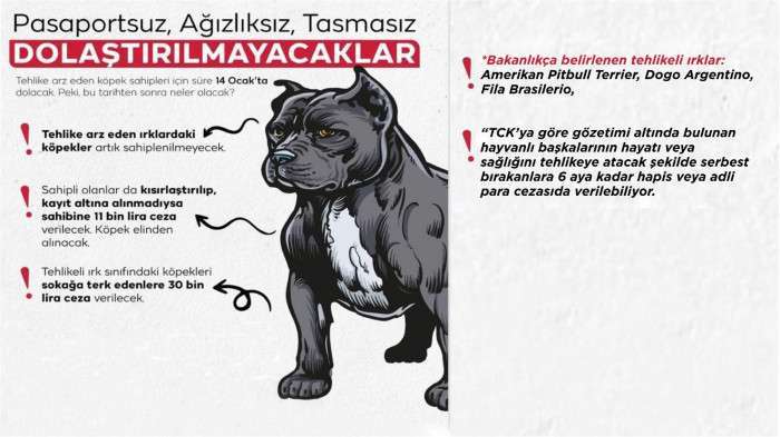 Açıklamanın devamında ise, “ 5199 sayılı hayvanları koruma kanununca tehlike arz eden ırklar, Amerikan Pitbull Terrier, Dogo Argentino, Fila Brasilerio, Japanese Tosa, American Staffordshire Terrier. American Bull olarak belirlenmiştir. Buna göre 5199 sayılı Kanunun 14 üncü maddesi hükmü uyarınca; tehlike arz eden köpekleri üretmek, sahiplenmek, sahiplendirmek, barındırmak, beslemek, takas etmek, sergilemek, hediye etmek ve bunların ülkemize girişini, satışını ve reklamını yapmak, yasaklanmış olup bu hükme aykırı davrananlara 5199 sayılı Kanunun 28 inci maddesi kapsamında idari yaptırım uygulanacaktır.