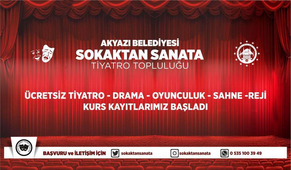 Akyazı Belediyesi Kültür ve Sosyal İşler Müdürlüğü bünyesinde sürdürülen çalışmalarda Sokaktan Sanata isimli proje ile Akyazı'da tiyatro meraklılarına ücretsiz imkan sağlıyor.