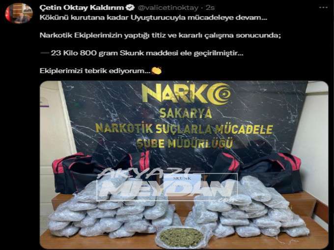 Operasyonu vali Çetin Oktay Kaldırım sosyal medya hesabından duyurdu. Kaldırım “Kökünü kurutana kadar Uyuşturucuyla mücadeleye devam… Narkotik Ekiplerimizin yaptığı titiz ve kararlı çalışma sonucunda; 23 Kilo 800 gram Skunk maddesi ele geçirilmiştir. Ekiplerimizi tebrik ediyorum” dedi.