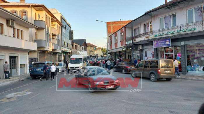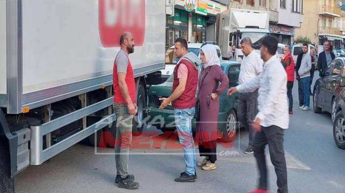 Pazar yoğunluğunun yaşandığı trafikte zincir markete ait bir kamyonun manevra yaparken otomobile çarptı.