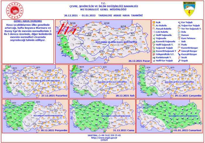 26 – 30 Aralık tarihleri arası Meteorolojiden yapılan değerlendirmelere göre ülke genelinde hava sıcaklıkları artacağı hafta boyunca 3-5 derece üzerinde diğer yerlerde mevsim normalleri civarında seyredeceği tahmin ediliyor.